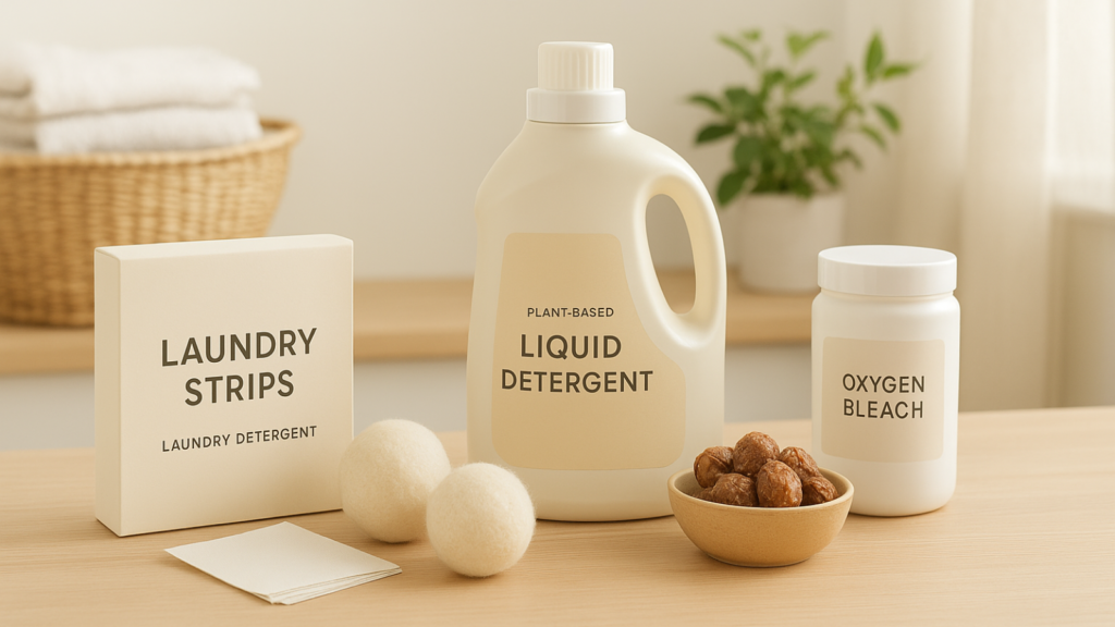 Essential laundry products include biodegradable laundry sheets or strips, plant-based liquid detergent in refillable containers, wool dryer balls, soap nuts for sensitive skin, oxygen-based bleach alternatives, and eco-friendly fabric softener. Brands like Tru Earth and Dropps offer convenient strip formats.