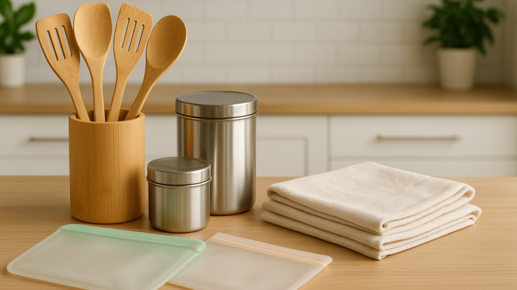 Popular choices include beeswax food wraps, reusable silicone food bags, bamboo cutlery sets, stainless steel straws with cleaning brushes, Swedish dishcloths, and reusable produce bags. Look for certified organic materials and products made by B-Corp companies committed to sustainability.