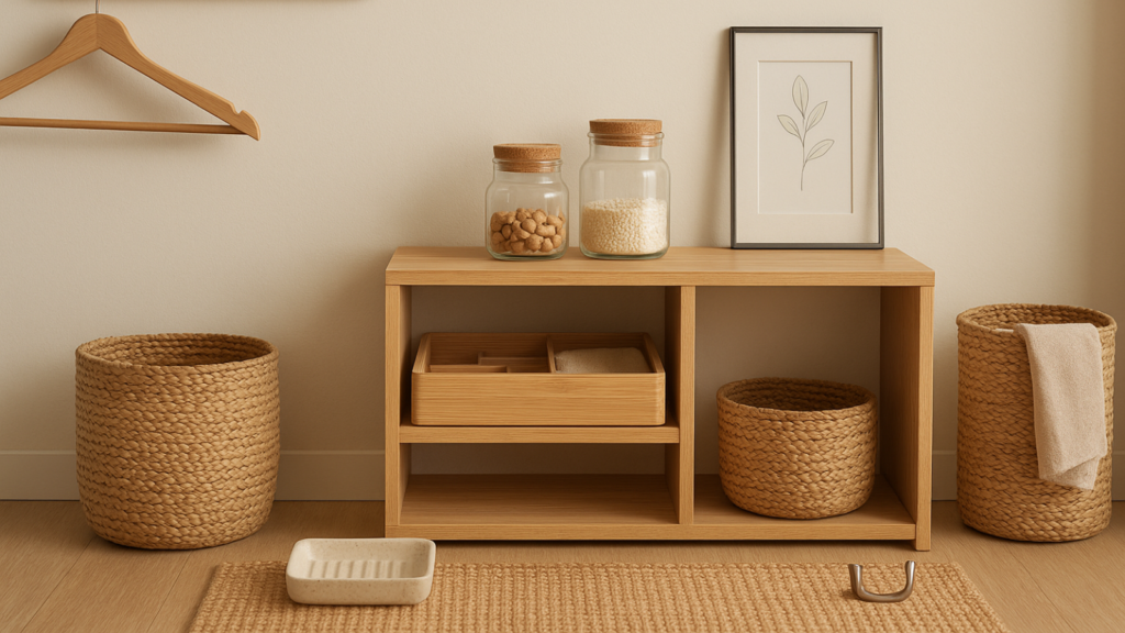 Replace plastic hangers gradually with wooden or bamboo options. Choose glass jars for bathroom storage instead of plastic containers. Use metal bookends, woven baskets for organisation, and ceramic planters for houseplants. Clean natural materials with damp cloths and mild soap to maintain appearance.