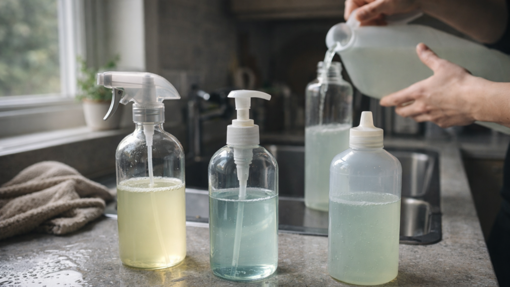 Label bottles clearly with contents and dilution ratios. Rinse bottles thoroughly between different product types. Purchase concentrated refills or make DIY solutions from simple ingredients. Join refill programmes at local zero waste shops. Clean spray nozzles regularly to prevent clogging. Store concentrates safely away from children and pets.