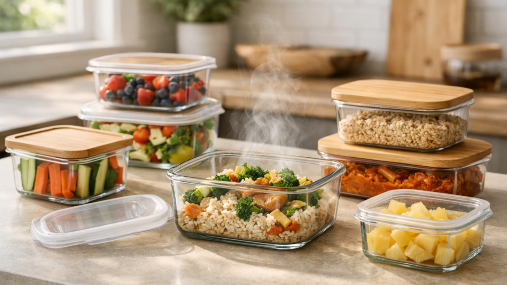 Glass manufacturing requires high temperatures but produces inert material lasting indefinitely with proper care. Glass is infinitely recyclable without quality loss. This represents truly circular materials. Chemical-free composition ensures no substance migration into stored food. Tempered borosilicate glass resists thermal shock and breakage better than standard glass.