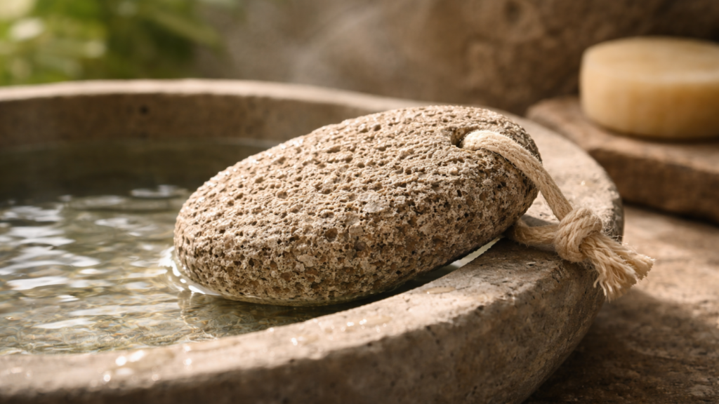 Volcanic pumice provides natural exfoliation for feet and rough skin areas without synthetic materials or microplastic pollution. Formed from volcanic lava, porous pumice gently removes dead skin whilst lasting years with proper care.