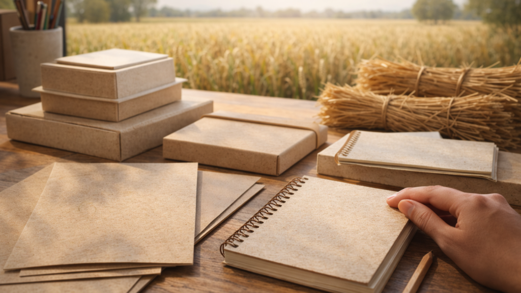Companies like Step Forward Paper, Papier, and Tree-Free Greetings specialise in wheat straw stationery and paper goods. Look for Forest Stewardship Council (FSC) or similar sustainability certifications verifying responsible sourcing. Many online retailers now stock wheat straw notebooks, greeting cards, and office supplies.