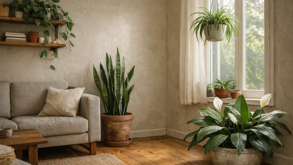 Snake plants (Sansevieria) tolerate neglect and low light. Pothos (Epipremnum aureum) grows vigorously, trailing beautifully. Spider plants (Chlorophytum comosum) produce abundant offspring. Peace lilies (Spathiphyllum) bloom reliably. Boston ferns (Nephrolepis exaltata) excel at humidity control. Rubber plants (Ficus elastica) make bold statements.