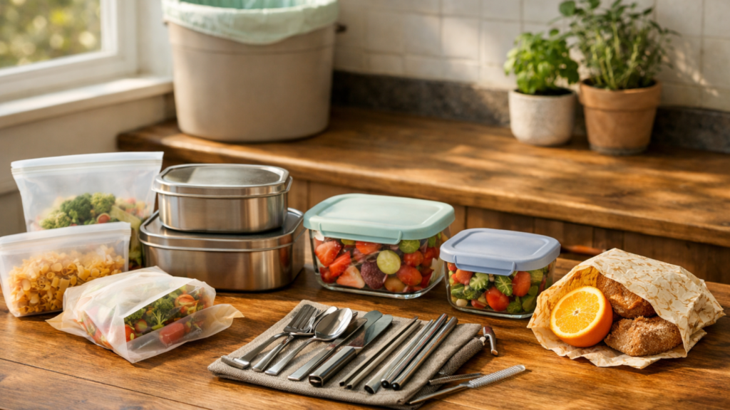 Description: Silicone food storage bags offer freezer-safe, microwave-safe, and dishwasher-safe convenience. Beeswax wraps mould around food items using hand warmth. Stainless steel containers provide durable, unbreakable options. Glass containers with silicone lids combine visibility with airtight sealing.