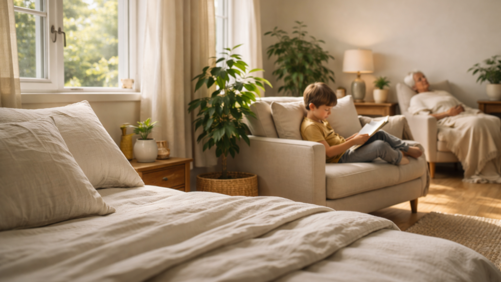 Sleep environment significantly influences rest quality through multiple pathways. Chemical emissions from mattresses, bedding, and bedroom furnishings can disrupt sleep architecture, prolong sleep onset, and reduce restorative deep sleep phases. Sensitive individuals may experience insomnia, restless sleep, or morning grogginess related to nocturnal chemical exposure.