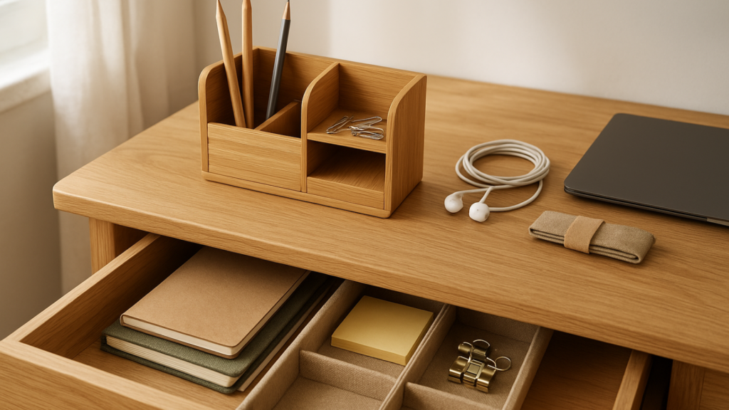 Desk Organisers: Bamboo or recycled cardboard versions keep pens, pencils, and supplies tidy. Multiple compartments prevent losing small items.