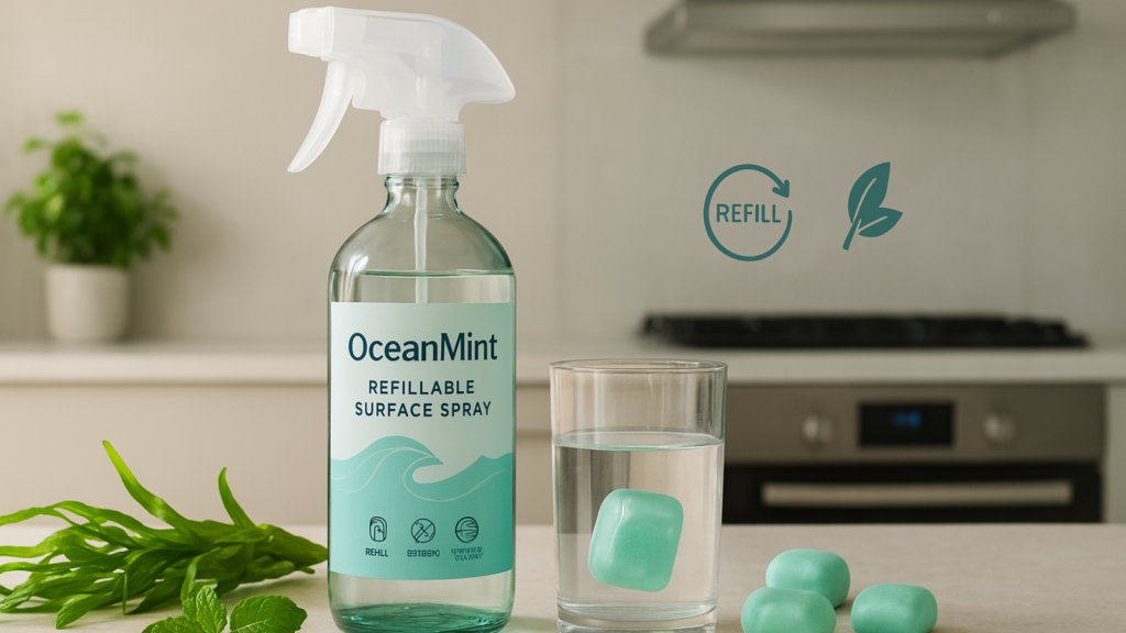 Eco Features: OceanMint pioneered waste-reduction through durable glass trigger bottles designed for years of use. Concentrated refill pods made from biodegradable film similar to laundry pods dissolve in water, creating full-strength cleaner. Each pod replaces one plastic bottle, preventing approximately 30 million plastic containers annually from production. Marine-inspired formula contains seaweed extract and mint oil, supporting ocean conservation charities with percentage of profits.