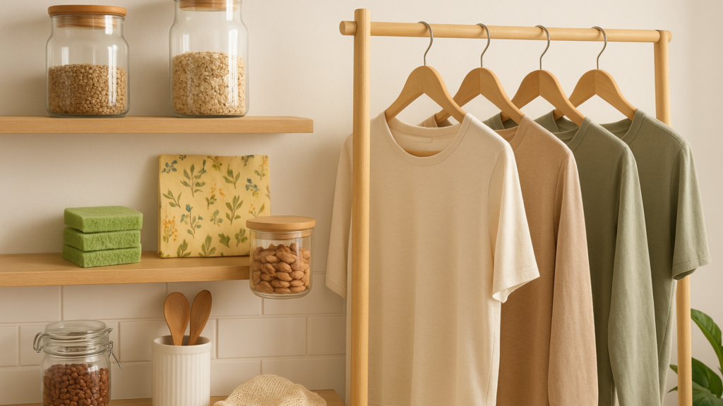 Practical alternatives exist across nearly every product category. Kitchen cupboards often contain glass storage containers, compostable sponges, or plant-wax wraps instead of single-use plastics. Clothing shelves now feature garments made from organic cotton, Tencel, or recycled polyester.