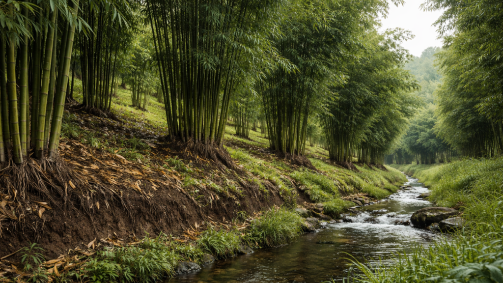 Soil preservation bamboo characteristics prevent erosion while improving land quality. Extensive root networks stabilise slopes. Slopes avoid topsoil loss during heavy rainfall. These fibrous roots create natural retention systems. This makes bamboo invaluable for watershed protection and landslide prevention on vulnerable terrain.